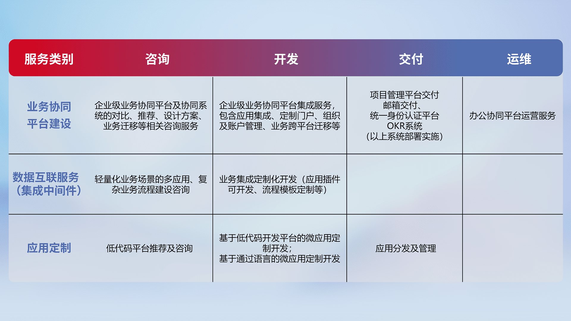 针对钉钉、、、、企微、、、、IDaas等平台级产品提供产品的规划、、方案、、、交付、、、定制化开发等服务,,实现如统一协同办公、、、智能客户服务、、混合会议管理、、智能数据查询、、、等业务场景,,实现数字化转型。。。。